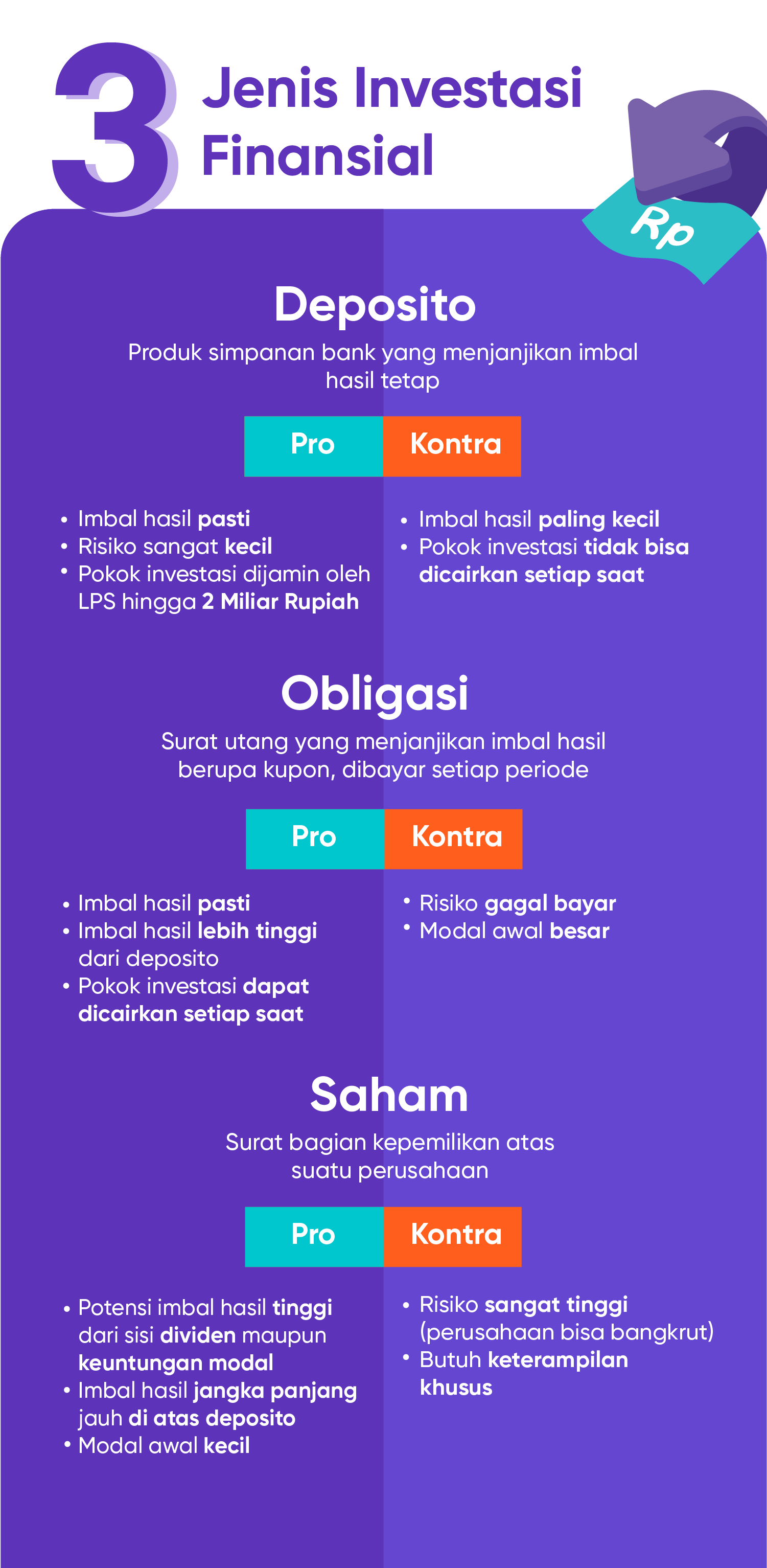 Investasi sebenarnya bisa dibilang gampang-gampang susah. Gampang jika kamu sudah memahaminya dan susah jika kamu sama sekali tidak memahami investasi yang kamu beli alias seperti membeli kucing dalam karung. Oleh karena itu, kali ini kita akan bahas 3 jenis investasi finansial yang paling awam di Indonesia yaitu: